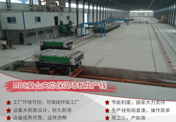 3.M08復合保溫墻板生產線有M08-20(單線年產20萬㎡)、M08-50(單線年產50萬㎡)、M08-100(單線年產100萬㎡)等產能選擇,用戶可以根據自身投資大小選擇合適產能。