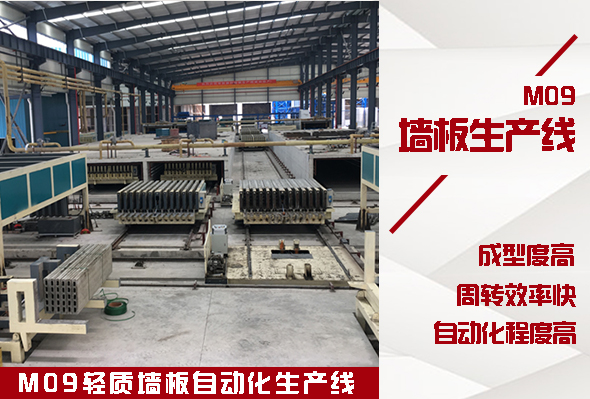 目前全自動輕質墻板生產線還未被廣泛應用,很多輕質墻板廠家采用的生產裝置生產效率低,勞動強度大,合格率低,不能保證產品的質量。為此瑪納公司研制開發了全自動多功能墻板生產線—M09輕質墻板生產線,該輕質墻板生產線具有成型精度高、周轉效率快、自動化程度高等優勢,主要設備包括:上成型機、擺渡車、凈面機(非布網/筋選用)、自動布料機、抽/穿芯一體機、出板接板機構、功能主機部分,可根據客戶不同需求在生產線原有基礎上修改定制,可滿足各種輕質墻板生產需求。