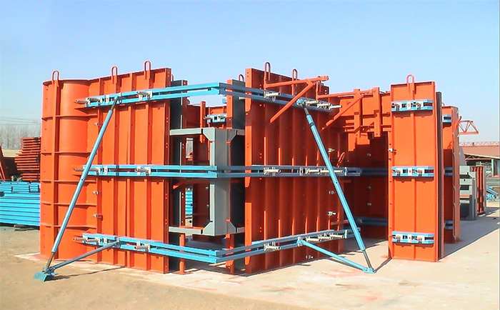 模板采用3.5mm厚鋼板卷制成型,剛度好,重量輕,吊裝方便,系統牢固耐用,滿足建筑的技術安全要求。模板背面采用小鋼板,應具有足夠的強度和剛度,保證混凝土澆筑過程中模板系統的變形控制在1-3mm以內,內外角模板為一塊完整的鋼板,整個鋼板由卷板機轉到一個小的弧形角,從90°處軋制,使分割部分不存在焊縫。豎向框架上的鋼板采用進出口形式張拉,并選用可調配的方法,只有大模板系統的節點剛性好,才能克服原則上墻體澆筑滲漏的常見質量缺陷。梁與墻遮陽相結合,消除預埋鋼筋和單獨梁洞口的問題,后墻洞口三面寬100mm,形成15mm厚的門框,可有效防止后墻洞口清理后的滲透;模板系統通用性強,結構簡單,制造方便,拆裝方便,充分滿足了模板的嚴密性和靈活性要求。