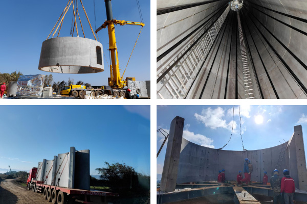裝配式風(fēng)電混塔,采用多節(jié)多片組裝而成,一般高度均在100米以上,最高有180米。底部最大直徑有11米,頂部最小直徑有4米,每節(jié)高度2~4米不等,采用高強(qiáng)度混凝土澆筑而成。