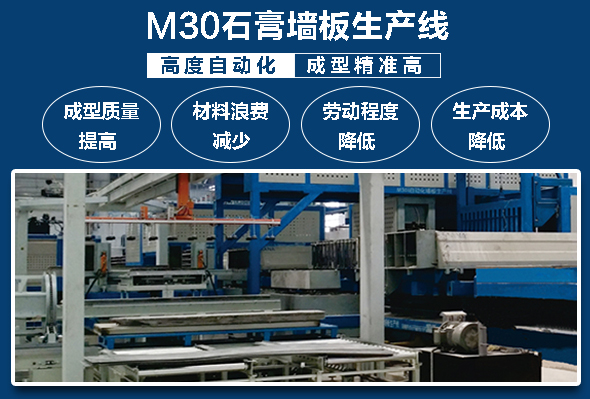 為實現石膏空心隔墻板自動化目的,該石膏空心隔墻板機M30石膏墻板生產線包括,自動圍擋刮面機、上抹面成型定位機構、合板翻板機構、第三代液壓抽芯機、第三代成組立模等。該生產線生產的石膏空心隔墻板具有成型"精準高、輕質高強、耐水、防火"等特性,從研發至今一直深受客戶的好評。
