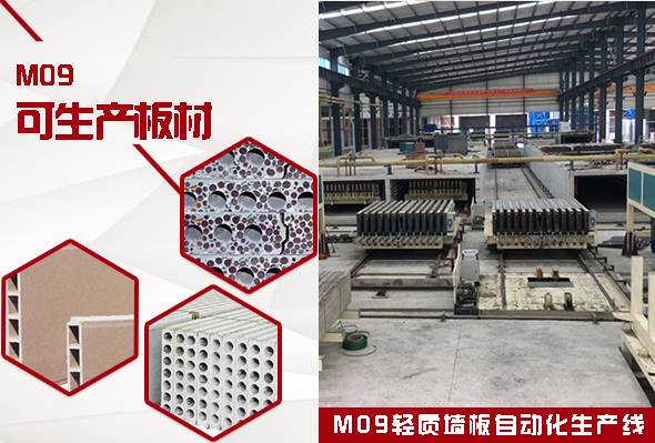 瑪納M09輕質墻板生產線主要設備組成有:①擺渡車:無線控制變頻行走及精確軌道定位,用于成組立模的轉向調度,②合板翻板機構:完成合板及翻板技術,用于板材的翻轉、打包;③推板機構:集合出板及隔板清理復合技術,配合成型立模,用于板材出模;④上成型定位機構:用于板材上成型面的定型;⑤自動布料機:配合成組立模,用于精準布料;⑥第三代液壓抽芯機:大抽拔力變量控制技術,配合成組立模,用于空心板材的抽孔穿孔;⑦第三代成組立模:不漏漿及大剛度技術,用于板材成型的主要設備。